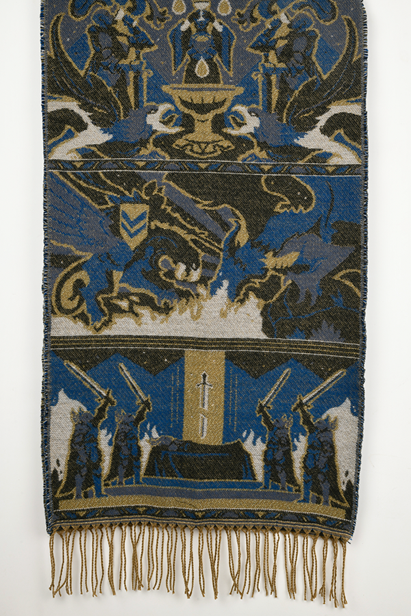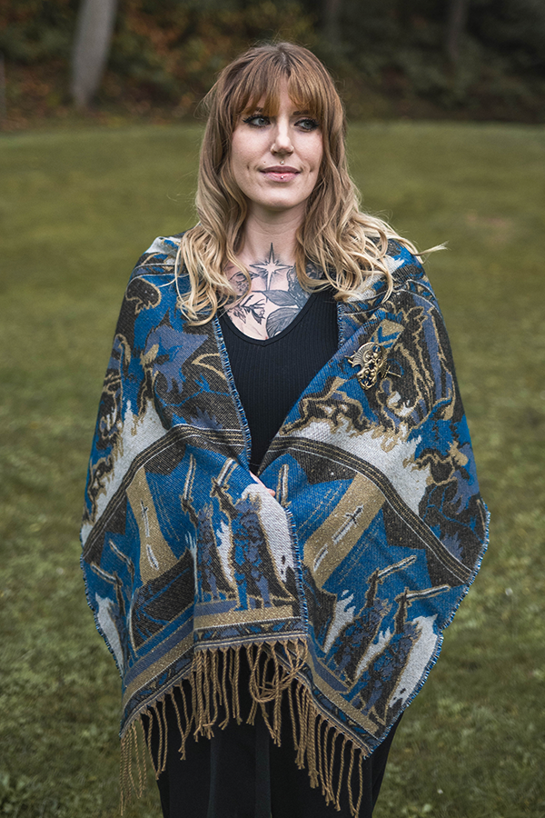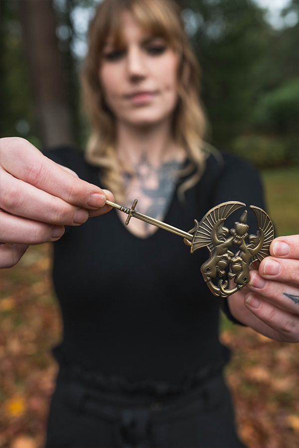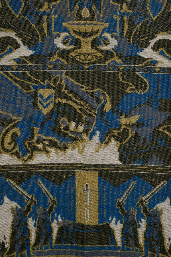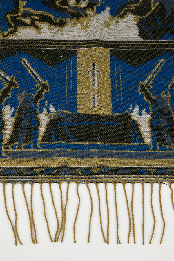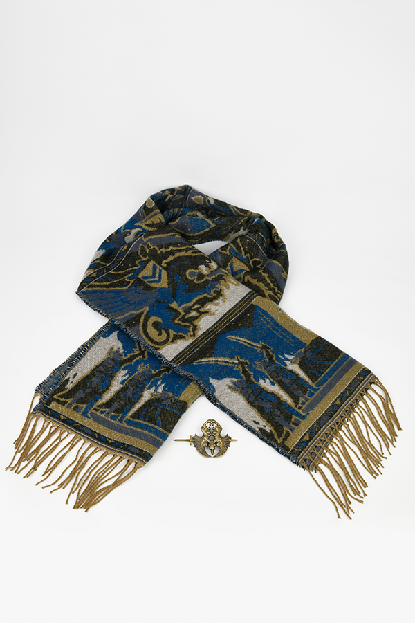 L'ensemble cape et broche Dragon Age Tale of a Grey Warden est un hommage aux héros de Thedas. Sur la cape, trois images illustrent les principales étapes de la vie de service d'un gardien gris : L'épreuve de la jonction. Le fléau de la Flétrissure. L'honneur de tomber au combat. Cette histoire est racontée en bleu et en or, les couleurs portées par les gardes gris.