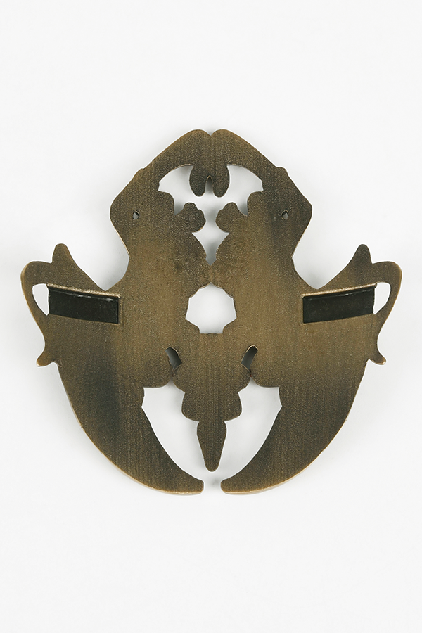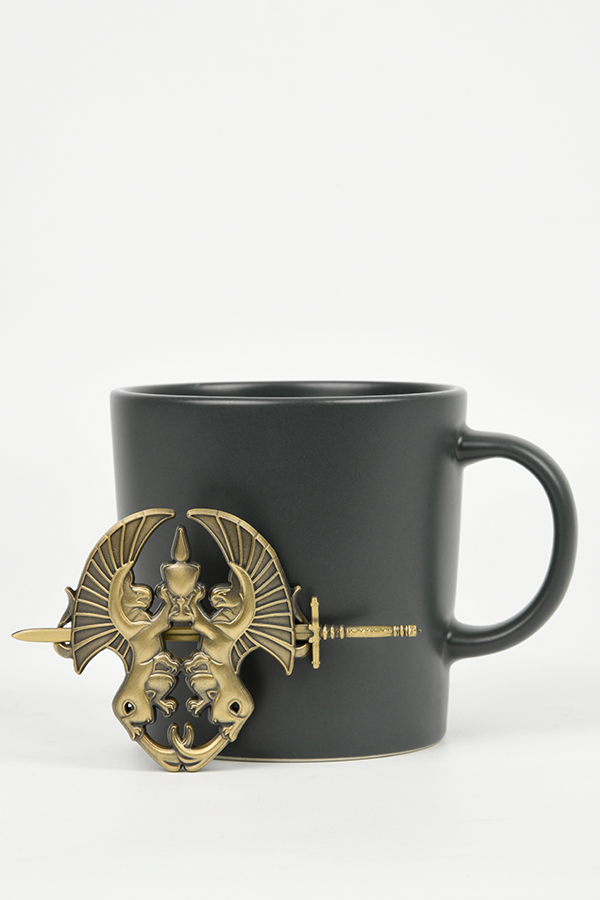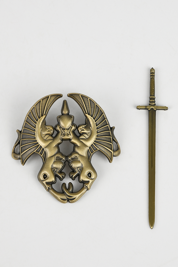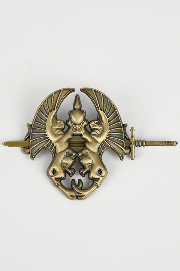 La broche est fabriquée avec une finition en or antique. Elle représente une paire de griffons - qui ont combattu aux côtés des gardiens gris - tenant le calice de jonction. Une épée miniature est incluse pour maintenir la broche en place.