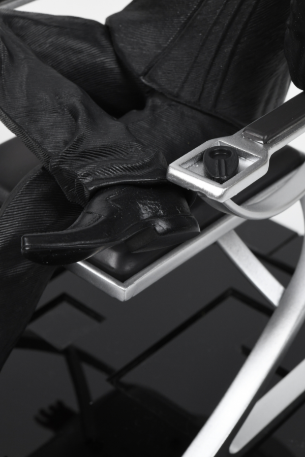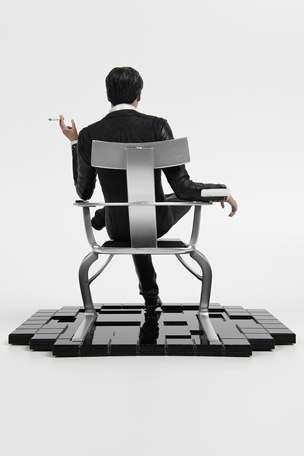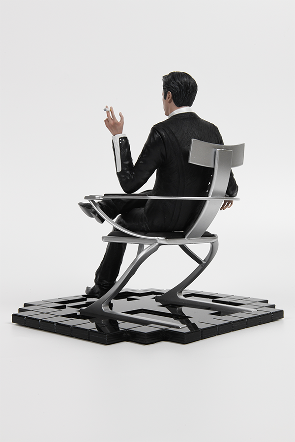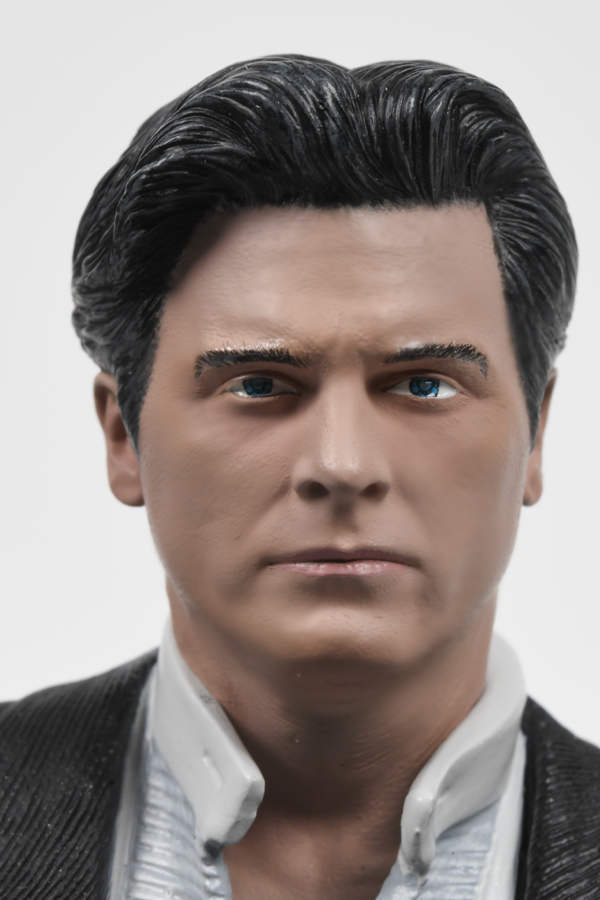 Cette sculpture en résine capture la ressemblance de l'Homme Illusoire, sinistre à tous égards. Ses cheveux gris argenté coupés de près, sa mâchoire rasée et ses étranges yeux bleus sont tous recréés.