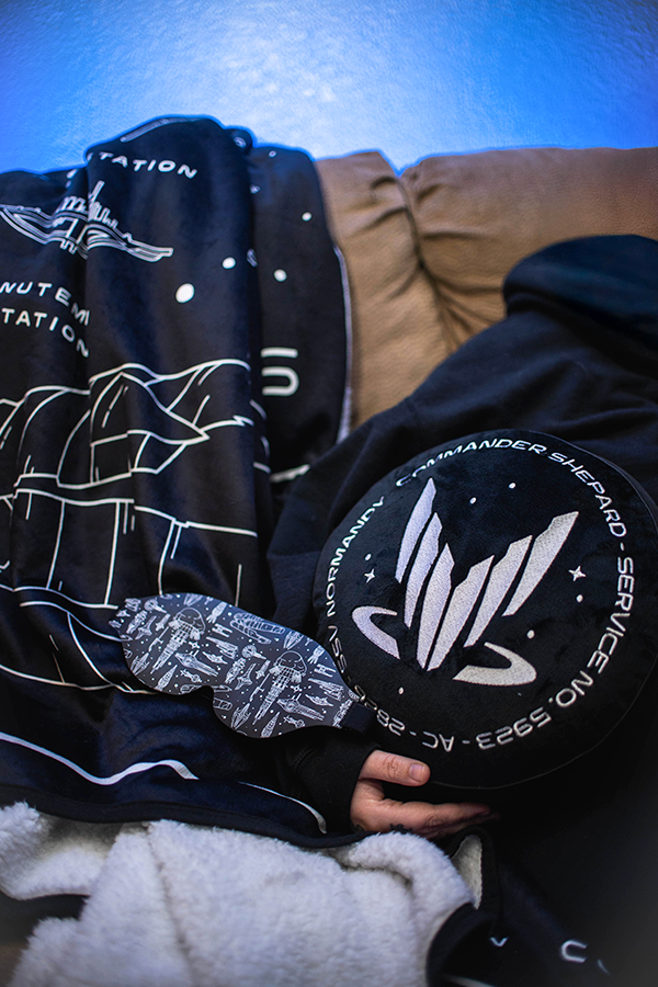 Dormi sotto le stelle e le più belle astronavi della Via Lattea! Il Mass Effect Ships of the Galaxy Cuddle Bundle comprende una coperta matrimoniale e una benda con le illustrazioni delle diverse astronavi presenti nel gioco (senzienti o meno). Il pacchetto comprende anche un cuscino rotondo con l'emblema di uno Spectre, circondato dal nome del comandante Shepard, dal numero di matricola e dal nome della loro nave, la SSV Normandy.