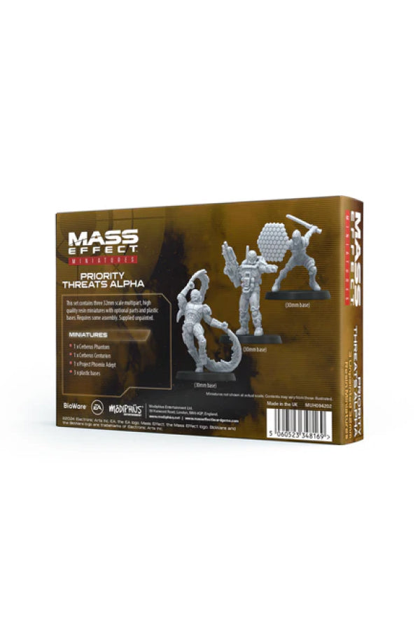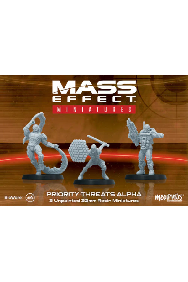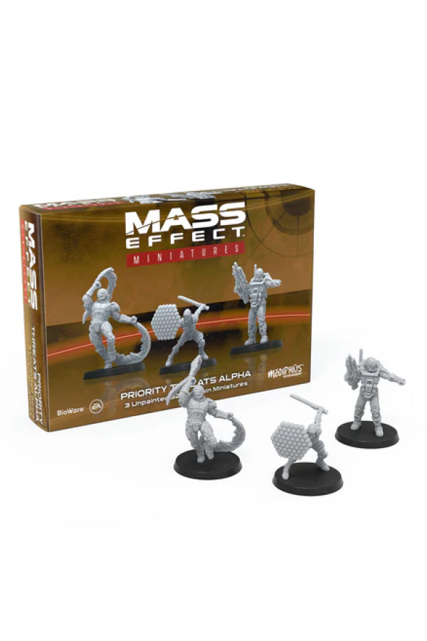 Upgrade your Mass Effect: The Board game experience with the Mass Effect Miniatures - Priority Threats Alpha. Each of these collector’s resin miniatures are in 32mm scale to fit the board game, and come with optional parts and plastic bases. Requires some assembly. Supplied unpainted.